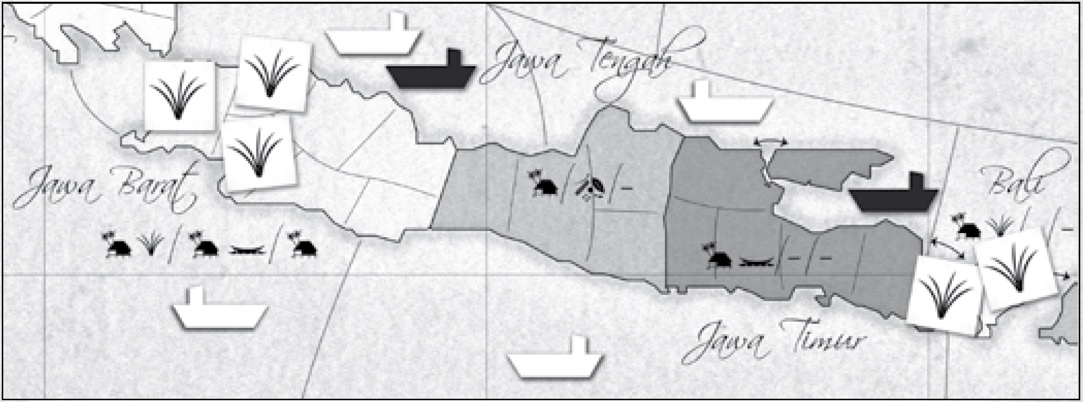 - After the merger is completed, the new owner must give up half of the goods (land areas) owned by the old companies (rounded up). Empty these areas of any goods. You can only give up areas at the border of your company’s estate—that is, you may not break contiguous zones of spice/rice by taking goods from the middle. Replace the rice/spice goods in the remaining areas with siap faji goods. So in the example above, the resulting company would consist of 3 siap faji goods.